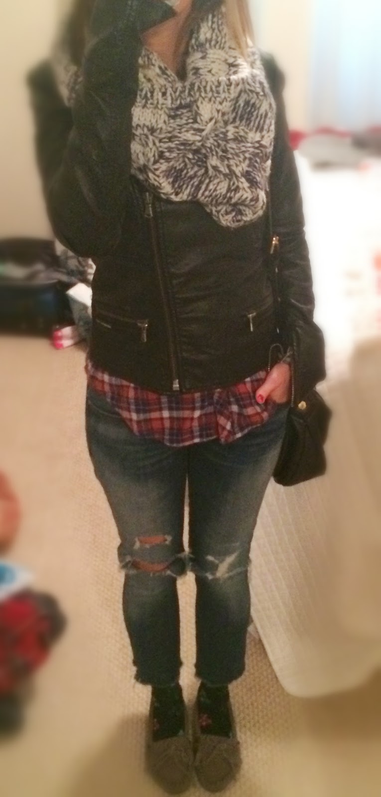 Urban Outfitters jacket and flannel, Gap jeans and scarf, Minnetonka moccasins, Target Christmas socks